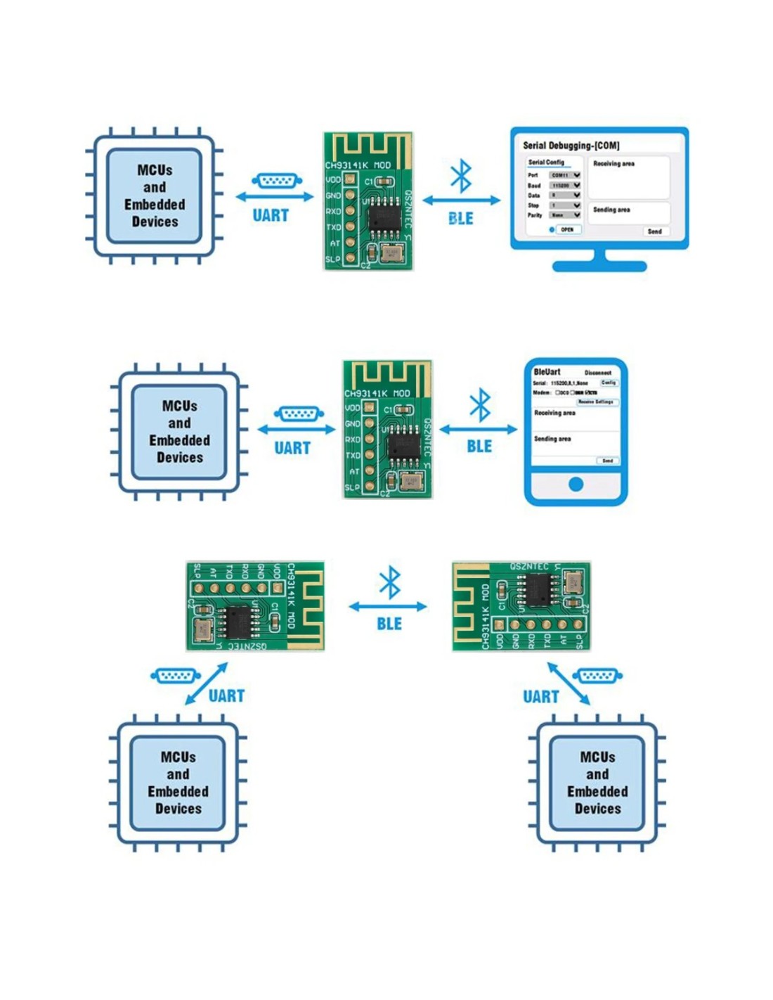 O CH9141K é um módulo compacto de comunicação sem fio baseado em Bluetooth Low Energy (BLE), projetado para funcionar como ponte entre dispositivos UART e dispositivos Bluetooth.