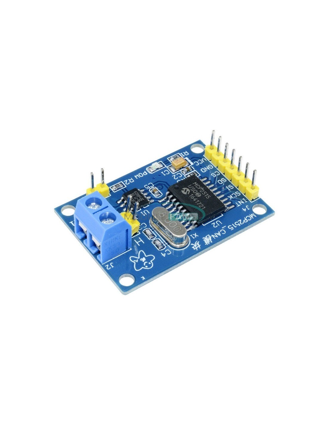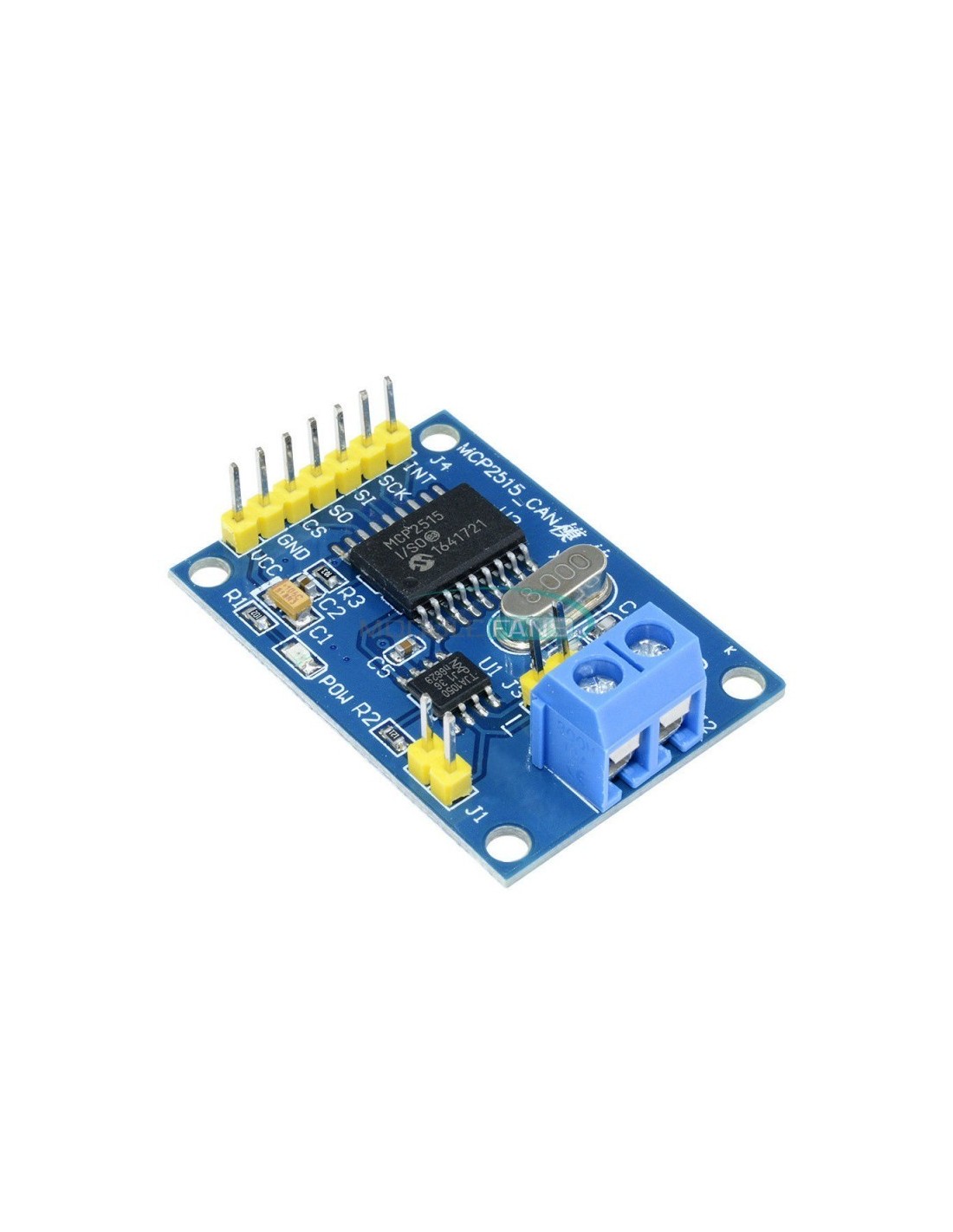 - Conectores: pinos para SPI (CS, SCK, MOSI, MISO), alimentação (5V ou 3,3V dependendo da versão), e saída para o barramento CAN (CANH, CANL).