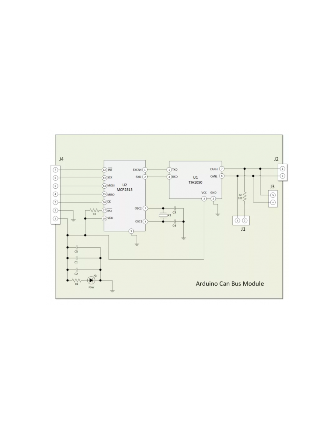 - TJA1050 ou SN65HVD230: transceptor CAN de alta velocidade, que converte os sinais lógicos do MCP2515 em níveis diferenciais (CANH e CANL) para o barramento físico.