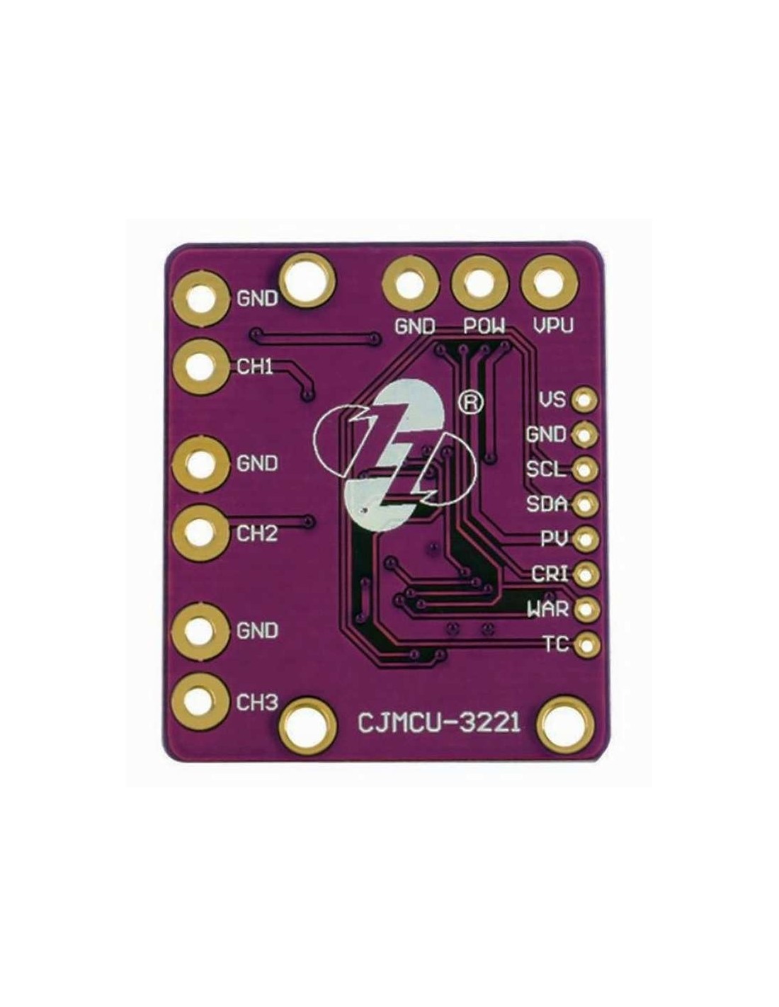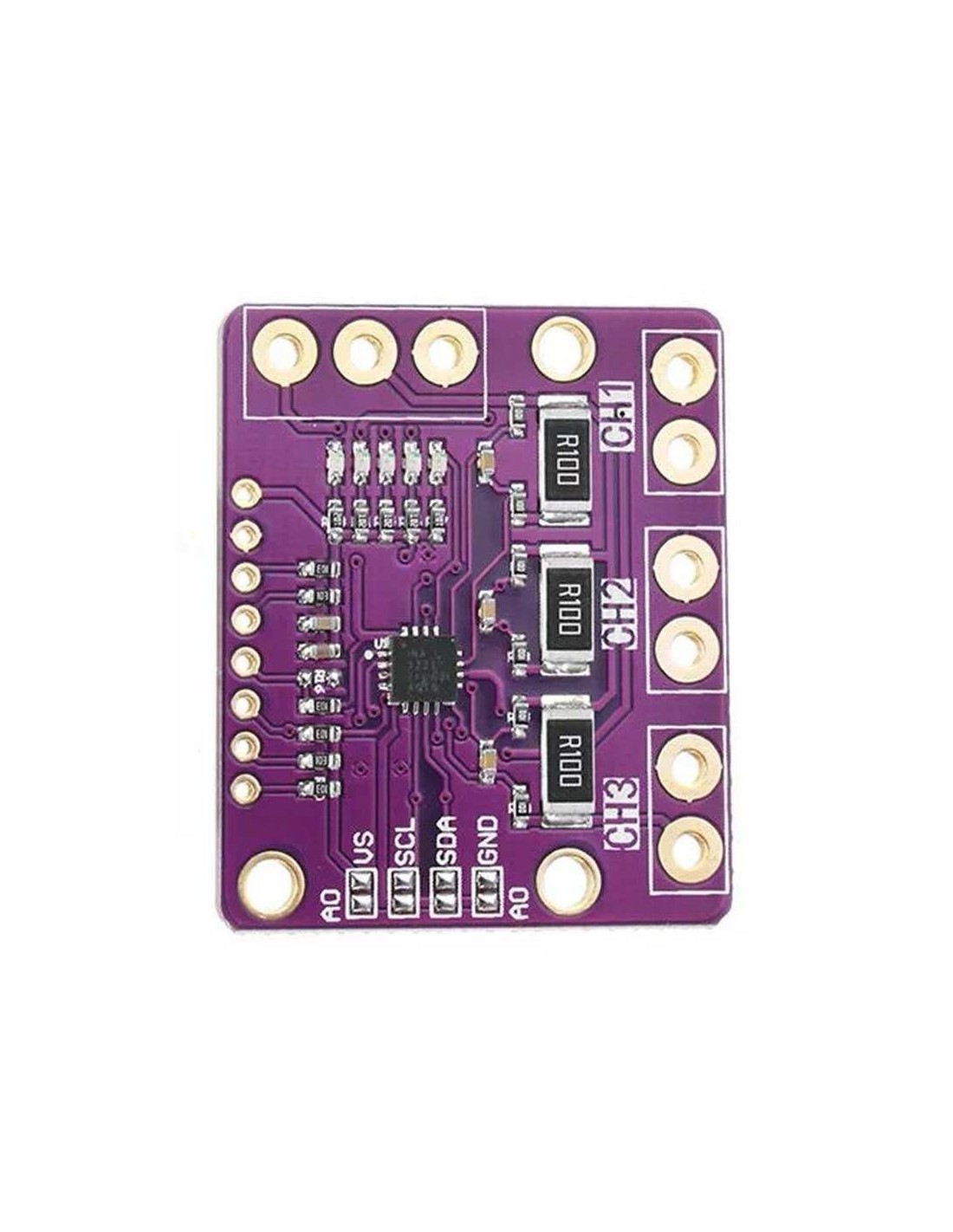 Inclui pinos para SDA, SCL, VCC, GND e entradas dos três canais (VIN1, VIN2, VIN3). - LED indicador de alimentação