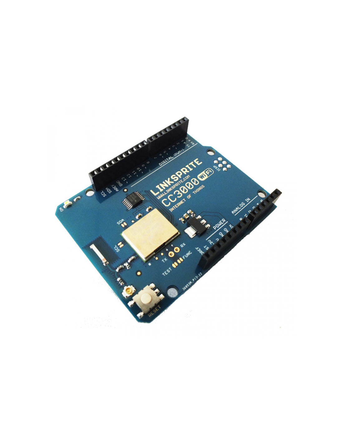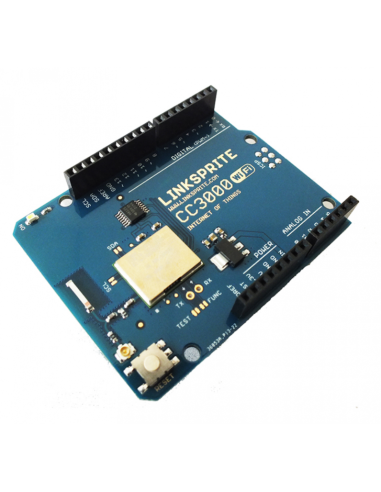 This CC3000 Arduino shield Integrated a onboard LDO, a chip Antenna, and a level logic shifter. It works fine with Arduino or Arduino compatible main board. It uses SPI for communication so you can push data as fast as you want or as slow as you want. It has a proper interrupt system with IRQ pin so you can have asynchronous connections. It supports 802.11b/g, open/WEP/WPA/WPA2 security, TKIP & AES. A built in TCP/IP stack with a "BSD socket" interface supports TCP and UDP in both client andserver