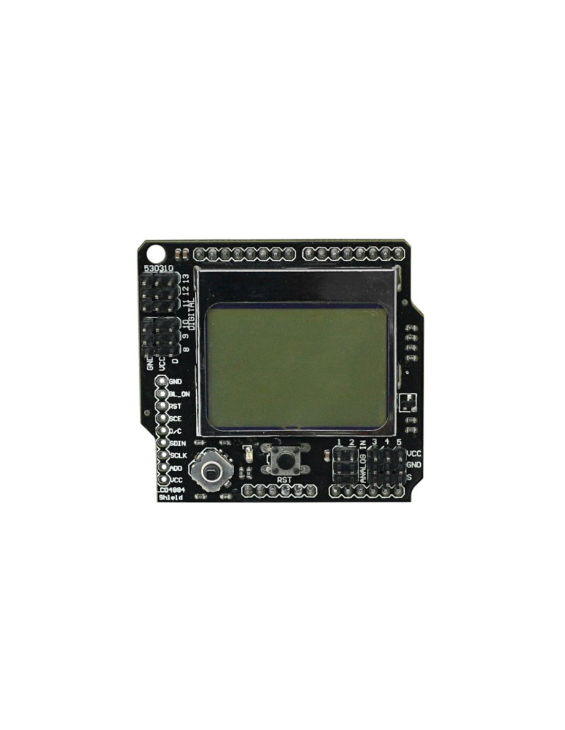 SainSmart Graphic LCD4884 Shield é um shield gráfico para Arduino que traz uma tela de 48x48 pixels (inspirada em displays antigos de celulares Nokia) e inclui um joystick de 5 direções, permitindo criar interfaces gráficas simples e interativas em projetos de eletrônica.
