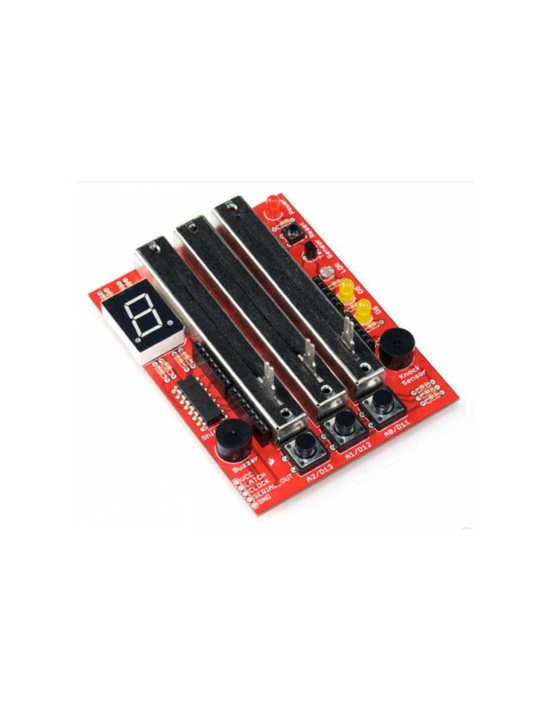 SparkFun Danger Shield é um shield educacional para Arduino cheio de sensores e atuadores divertidos, criado para ensinar eletrônica e programação de forma prática. Ele combina botões grandes, sliders, LEDs, buzzer, sensores de luz e temperatura, tudo em uma única placa que se encaixa sobre o Arduino UNO.