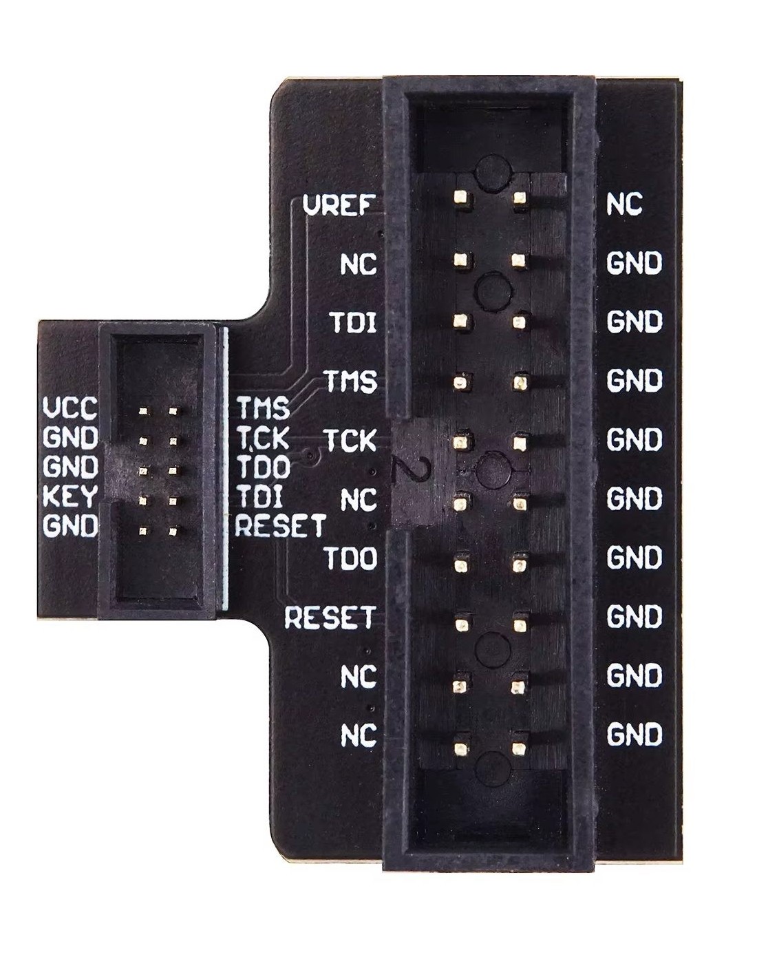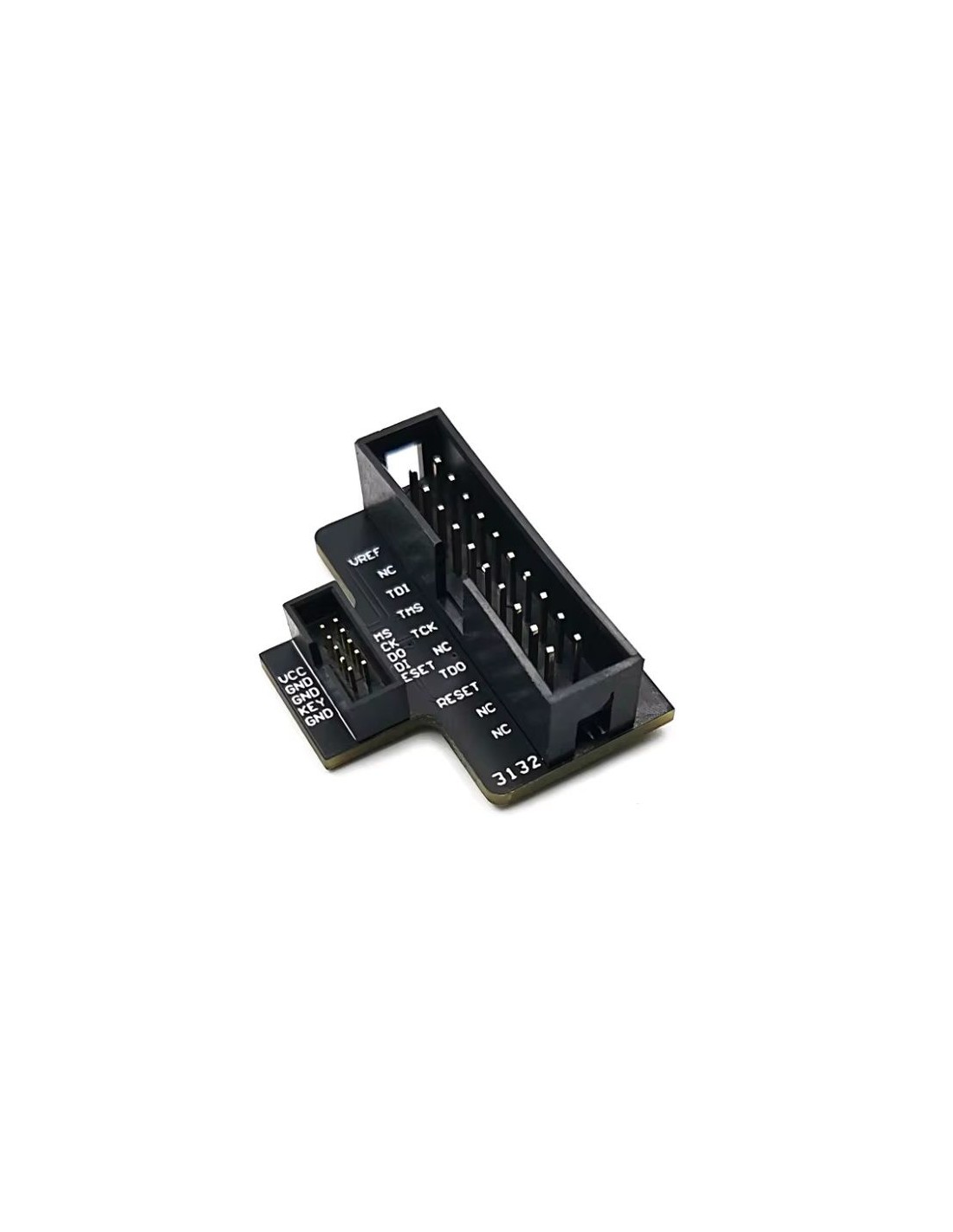 A placa mostrada é um adaptador JTAG projetado para converter conectores de passo 1,27 mm (0.05") — comuns em placas compactas, módulos ARM modernos e dispositivos de baixo perfil — para o padrão JTAG de 20 pinos com passo 2,54 mm (0.1"), utilizado pela maioria dos programadores e depuradores como J‑Link, ST‑Link, CMSIS‑DAP e outros.