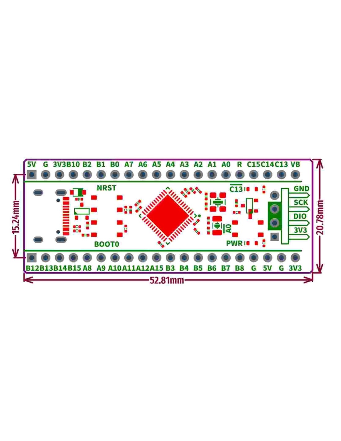A versão WeAct traz o chip em um formato fácil de usar, com regulador integrado, pinos acessíveis e suporte a programação via USB ou SWD.