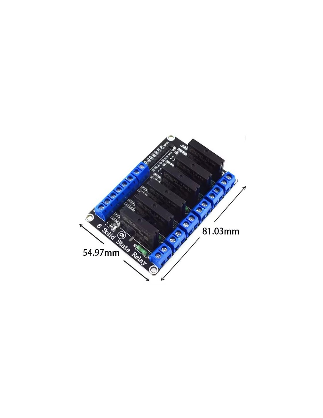A Placa de 6 Relés de Estado Sólido (SSR) é um módulo de comutação de baixo nível, alimentado por 5V, projetado para controlar cargas AC de até 250V / 2A.
