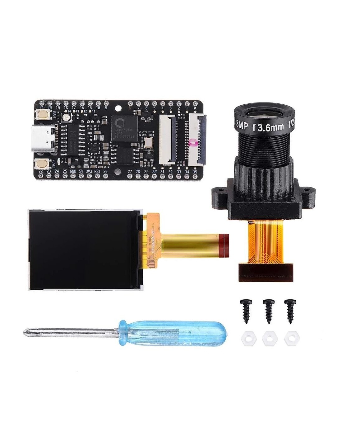 - Processador: Kendryte K210, dual-core RISC-V 64 bits, até 400 MHz