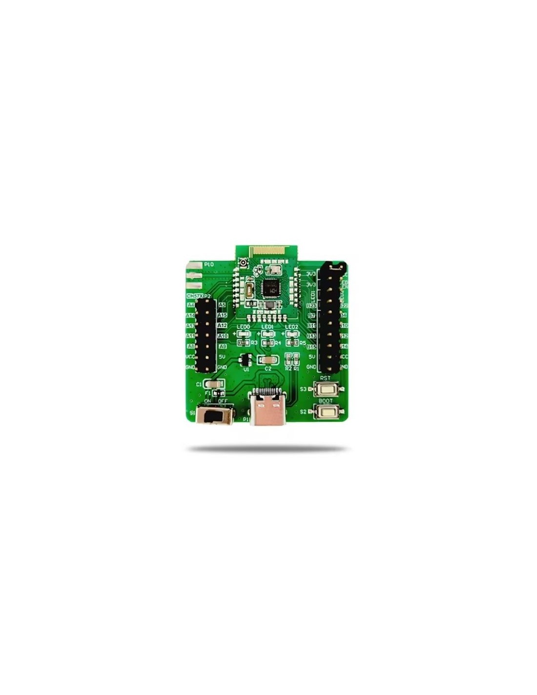 A CH582F‑EVT‑C é uma placa de avaliação projetada para desenvolvimento e testes utilizando o módulo CH582F‑MOD‑C‑ANT, que integra o microcontrolador CH582F com antena Bluetooth BLE embutida.