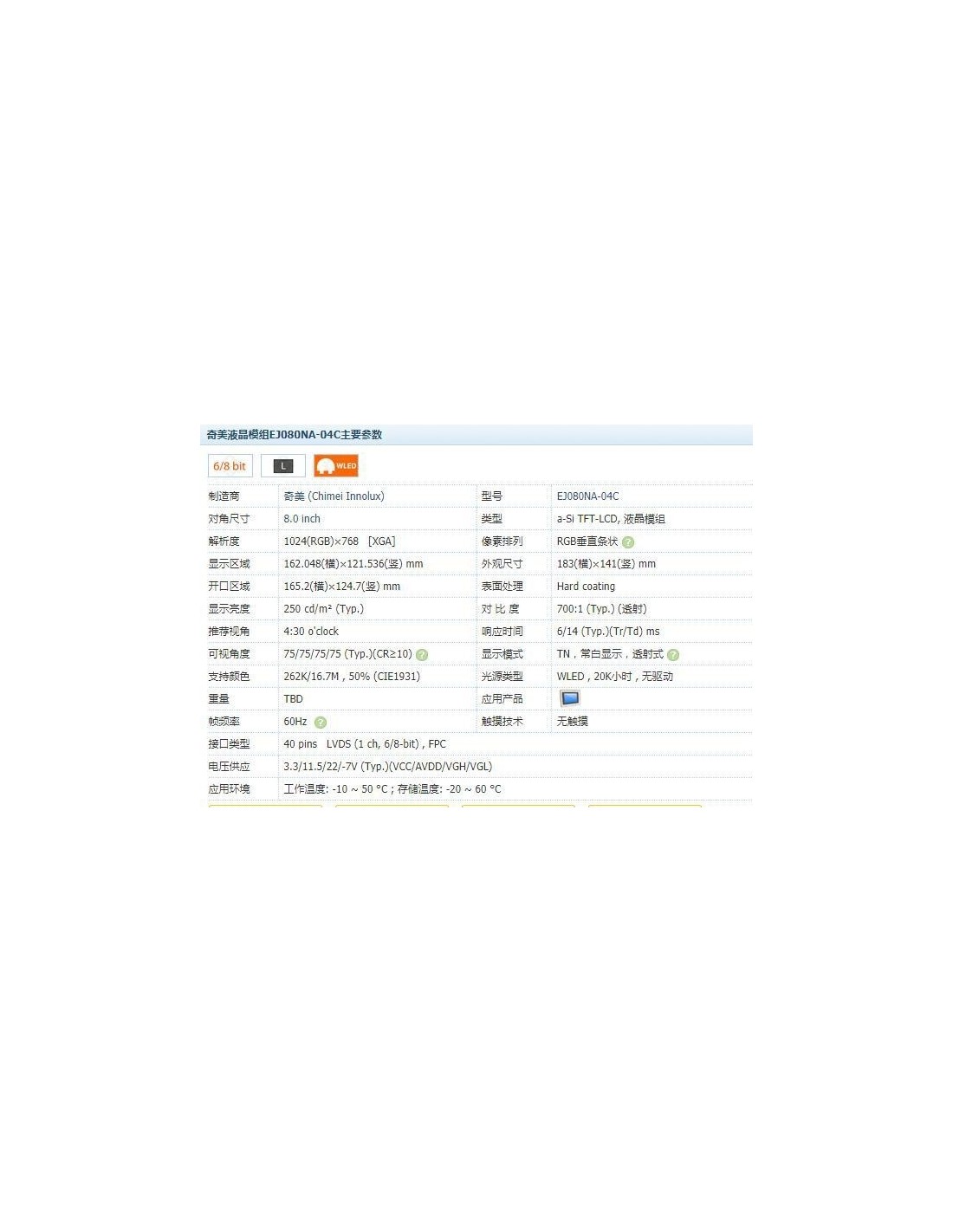 - Em alguns mercados, versões equivalentes são vendidas por Innolux (EJ080NA‑04B) ou CPT (CLAA080XA12LE), com especificações muito próximas.