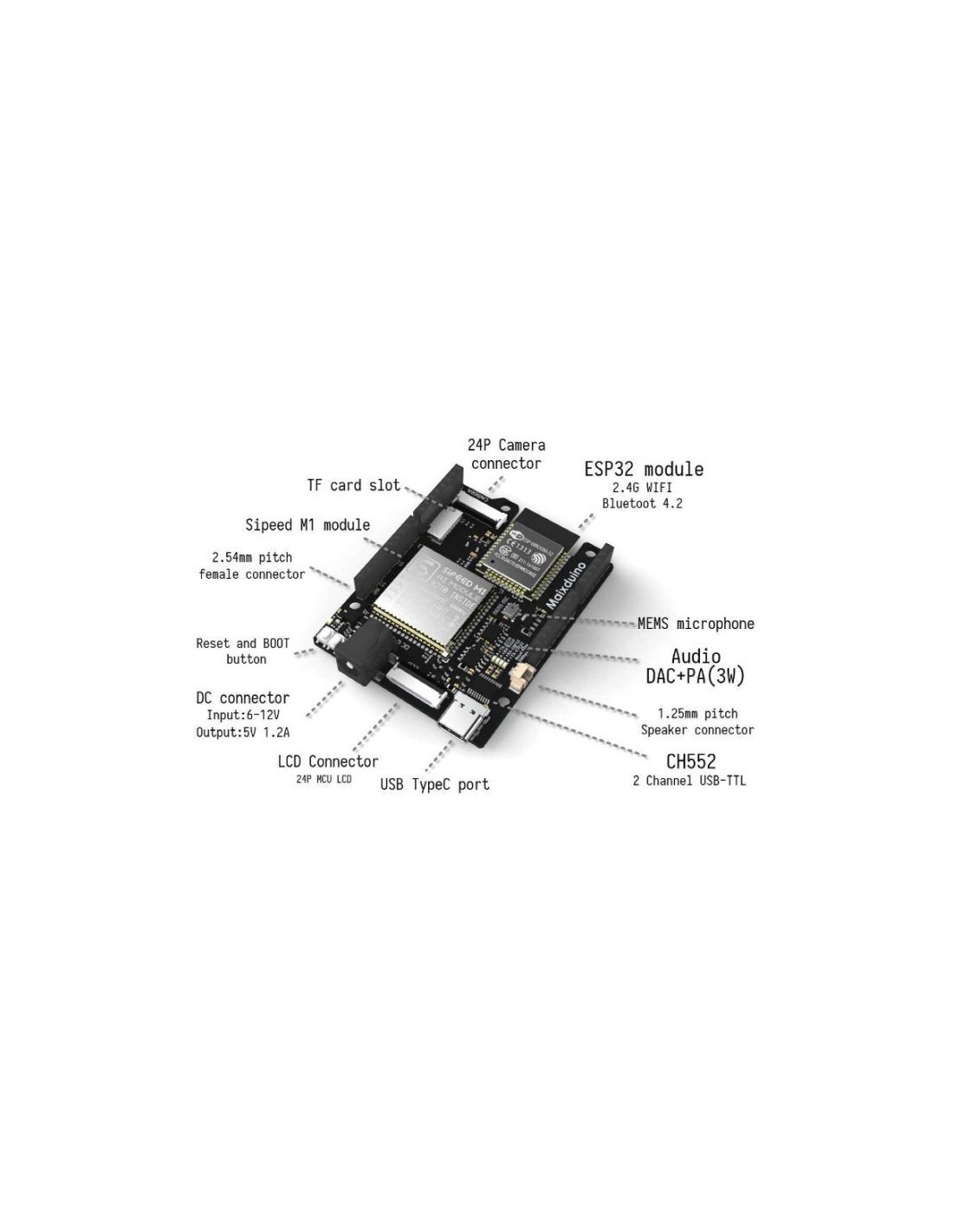 - Processador principal: Kendryte K210 RISC‑V Dual‑Core (400 MHz).
