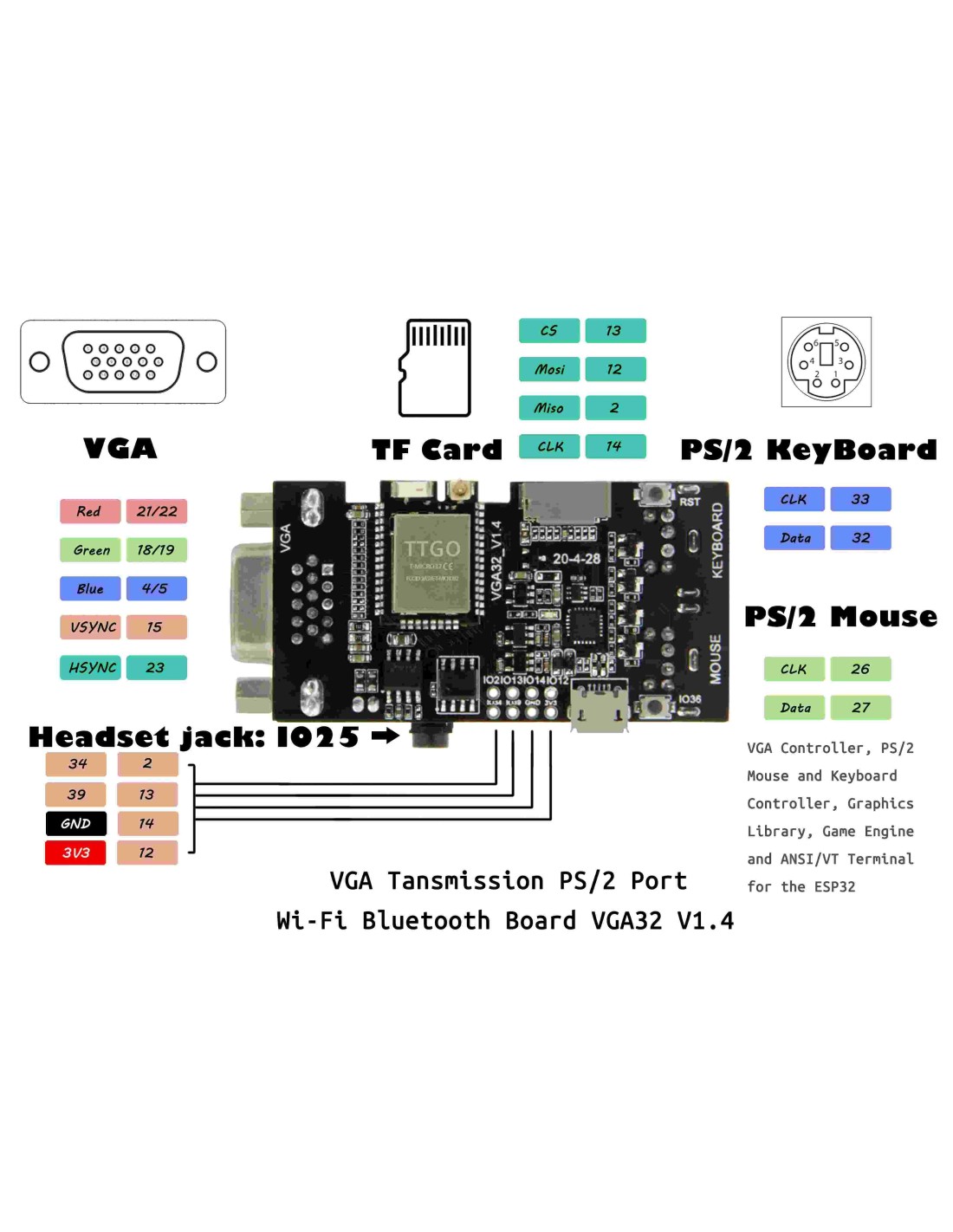 O LilyGO TTGO VGA32 v1.4 é um módulo de desenvolvimento avançado baseado no ESP32 com PSRAM integrada, projetado especialmente para aplicações gráficas, emulação e saída de vídeo VGA. Ele utiliza a poderosa biblioteca FabGL, que transforma o ESP32 em um sistema gráfico completo, capaz de gerar vídeo VGA, áudio, teclado PS/2 e até rodar emuladores clássicos.